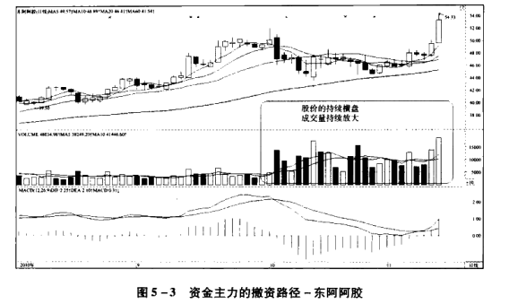 东阿阿胶图5-3股价的走势变化比较具有迷惑性,许多时候股价的涨跌不大,甚至有时还出现股价的上涨。但成交量的持续放量就很不乐观,尤其是对于中大盘股而言,成交量稍微大些,资金的量就非常大。对于成交量的连续放大,资金的动向就是关键。