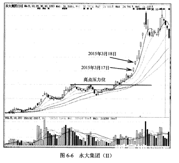 我们看当时的K线图。图6-6是永大集团在2014年11月~~2015年4月的K线走势图。图6-5分时即图6-6中2015年3月18日的K线分时。我们看到图中的K线走势正处于向上加速的阶段。在前一日,即3月17日已出现跳空上涨的走势。稍后我们会对比两日的分时走势的不同。在此处我们要强调的是买点的选择。3月18日和3月17日是一个非常好的买点,短线的涨停板就是我们出击的点位。