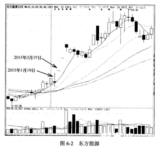 图6-2是东方能源在2014年12月~2015年4月的K线走势图。图中走势出现了停盘后涨停的走势。我们看看当时的消息面是什么样的。