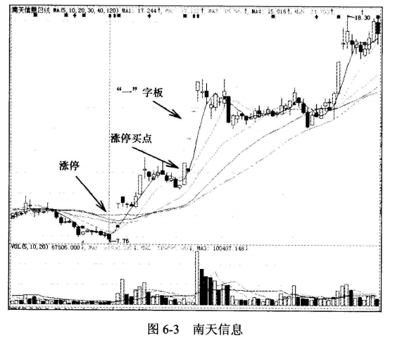 图6-3是南天信息在2014年4月~2014年11月的K线走势图。图中“-”字板处的涨停,就是我们所说的可借助技术分析捕捉到的涨停板。对照前文,此处的“一”字涨停板正是我们前面和大家解述的“二档涨停”。而在当日做出买点判断的并不单指这一点。