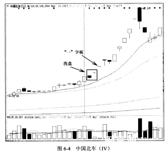 图6-4是中国北车在2015年3月~2015年4月的K线走势图。在图中出现了两个“一”字板。对比他们所处的阶段我想大家都能发现,他们出现的位置都是上涨加速的阶段。