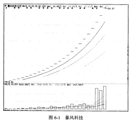 图6-1是暴风科技在2015年3月24上市以来的走势,股价一路一字板从最初的9.43元走到了100多元。翻了十多倍。我们不去谈论股价的合理性问题,对一般投资者来说,这样的走势是只有观望的份的。而当投资者可以买进的时候也正是主力出货的时候。