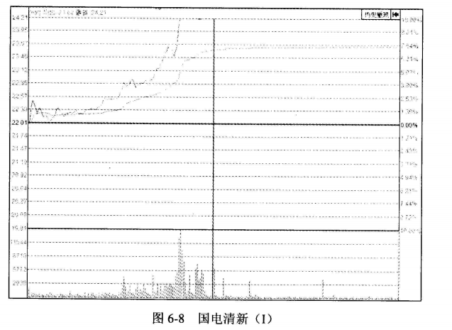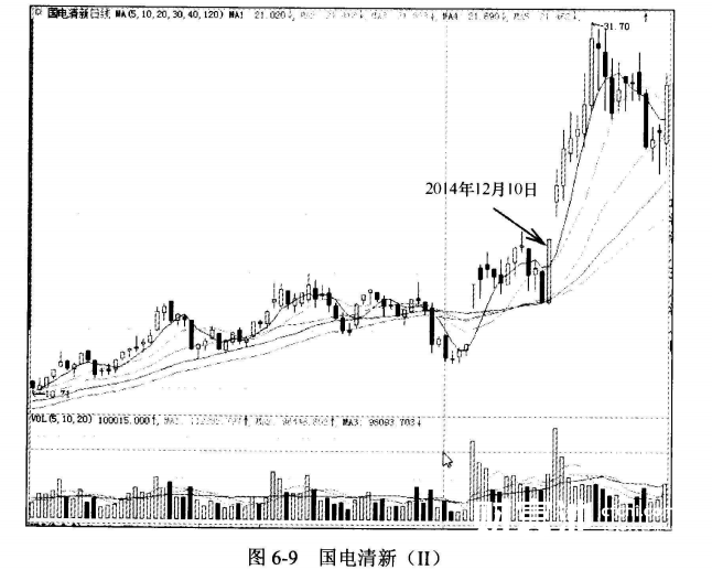 图6-8是国电清新在2014年12月10日的K线分时走势。我们看到股价平开,经过一个短暂的洗盘,股价平稳上升,量能放大,股价在接近午盘时也就稳稳地封在了涨停板上。