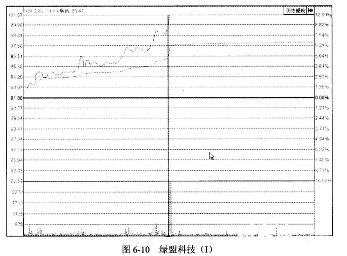 图6-10是绿盟科技在2015年4月21日K线的分时走势图。当日分时的走势仍然是平开一波涨停走势。