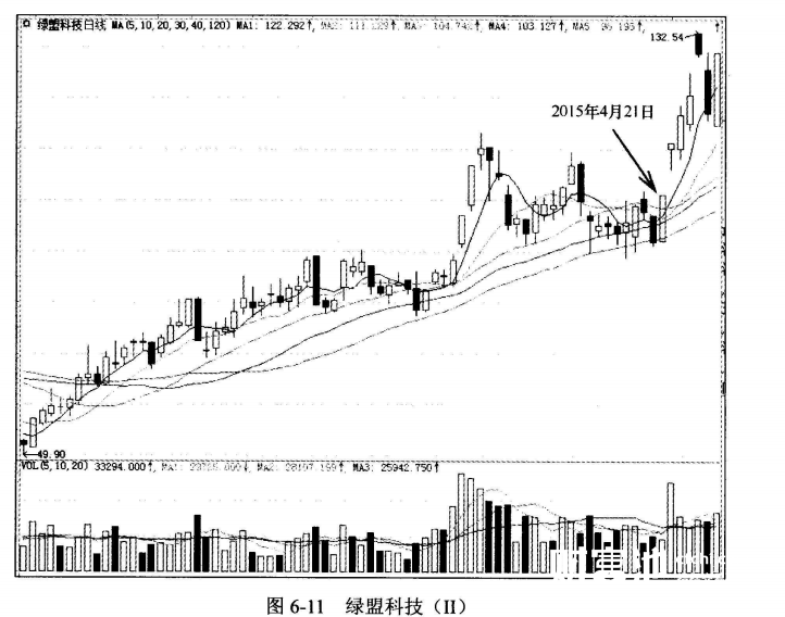 我们再来看看当时的K线走势。图6-11是绿盟科技在2015年1月~2015年4月的K线走势图。图6-10分时即图中4月21日K线的分时走势。
