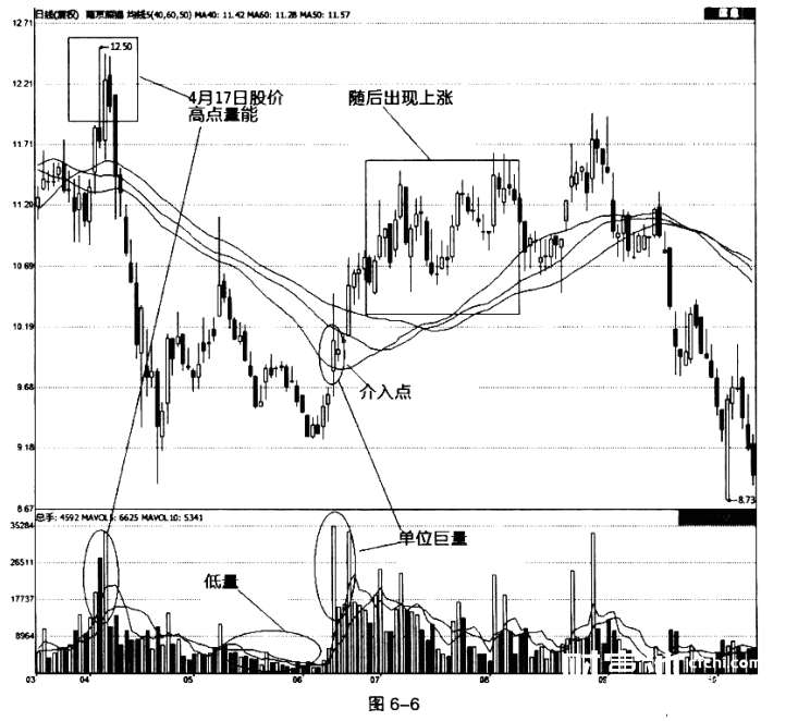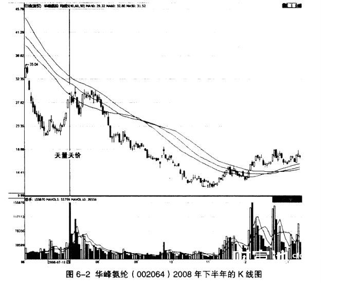 图6-2是华峰氨纶(002064 )在2008年下半年的K线图。主力利用反弹出货,走出了7月10日天量天价的图形。