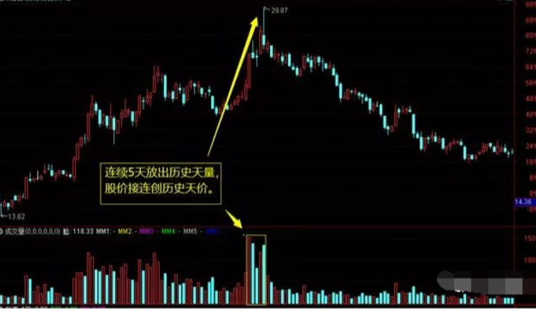 天量天价是指个股(或大盘)在成交量巨大的情况下,其股价(或大盘)也创出了新高的现象,这是量增价涨的极端形式。它常出现在长期上涨的末期,也是一种股市里的特殊现象。