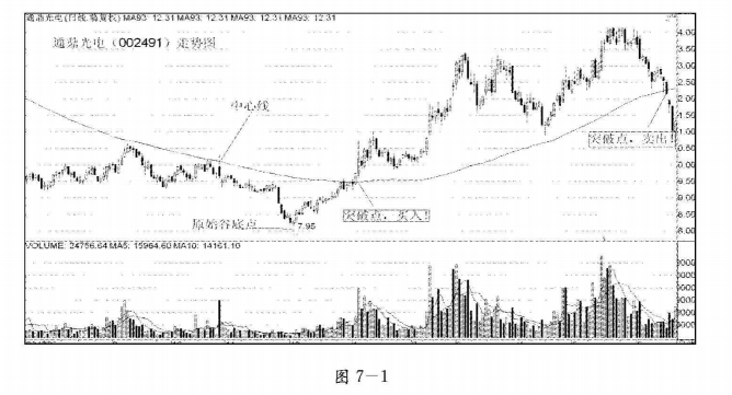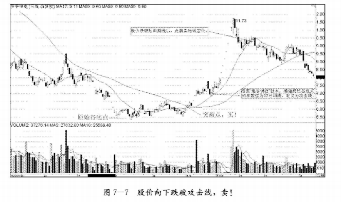 3.股价在中心线上,跌破攻击线,止嬴卖如图7—7。
