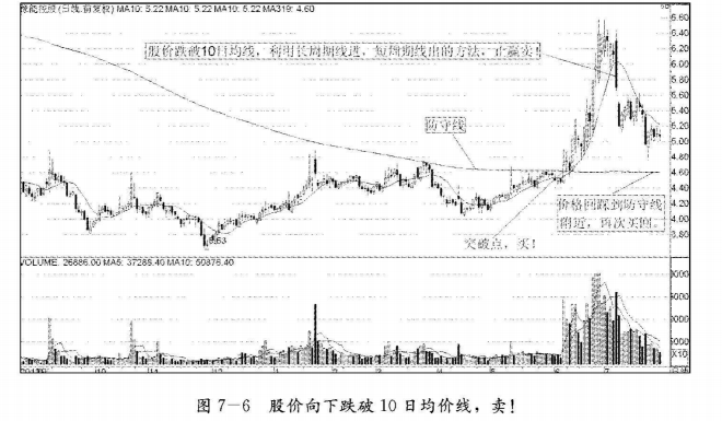 2.股价在防守线上,跌破10日均价线,止赢卖!如图7—6。