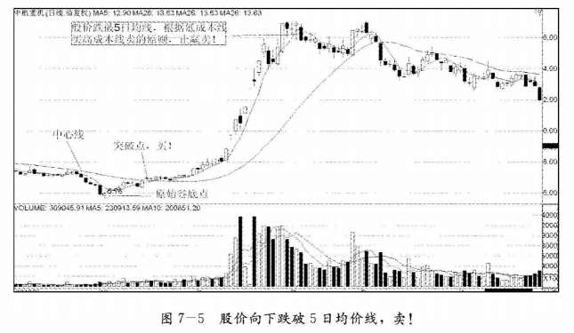 1.股价在中心线上,跌破5日均价线,止赢卖。如图7—5。