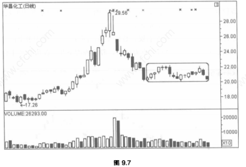 图9.7是华昌化工的日K线走势图,股价经过前期大幅上涨后,冲高回落,股价由29. 56元急速下跌,当股价下跌至20元附近时,股价出现止跌迹象,在21元的位置开始盘整。
