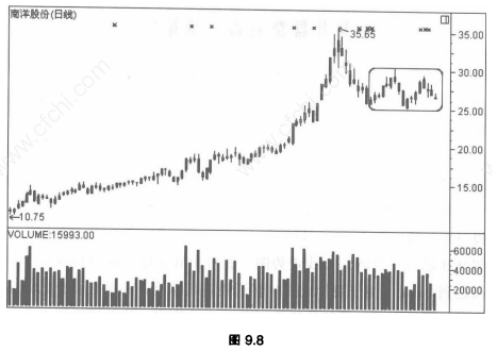 图9.8是南洋股份的日K线走势图,股价由底部开始震荡盘升,最高冲至35.65元,总体涨幅达150%,股价见顶下跌,由于股价涨幅较大,主力获利丰厚,即使股价下跌几个价位,主力也是有利可图,再说股价在高位散户跟进的少,主力也不能在高位安全出局,索性大笔卖出股票,让股价回落。