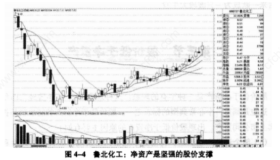 对于因为行业景气度低和冷门专业的股票,如果股价低于净资产,可以买入,等待股价重回净资产上方。实际上,股价只要接近净资产,就都是无风险获利机会。2007 年10月末,每股净资产为6.22元的鲁北化工由于大盘的强势回调,下跌至6.60元。实际上,此时其已经获得了重要的支撑,股价开始稳步上扬,很快涨到8元以上。