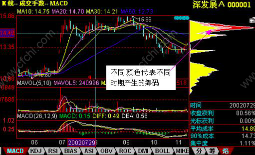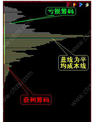 红色的线条表示在目前价位获利的筹码,绿色的线条表示在目前价位套牢的筹码,蓝色的线条表示当天新加入的成本;线条高度代表价格,长度代表持仓筹码在这一价位的比例。 随着十字光标的移动,线条长短和颜色会发生变化,指示了不同时间的持仓成本分布状况。
