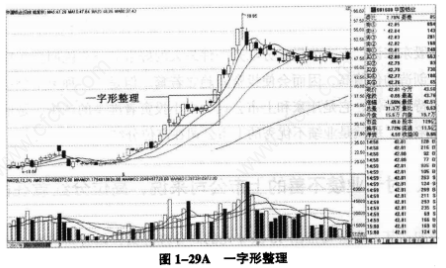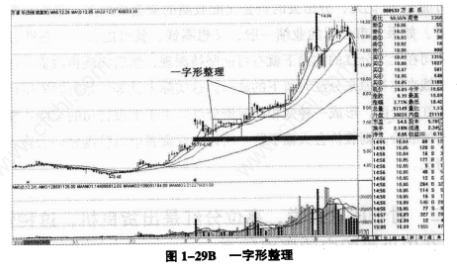 根据以上特点,我们还可以找出很多其他整理形态。比如,一字形整理。一字形是比较常见的中短线庄家采用的整理方式。这些庄家实力强悍,性格张扬躁烈,做事情讲究一气呵成,因此,股价只维持短暂的横盘整理,胆小者高处不胜寒就会主动退却。整理之后,就会直接到达目标价位。