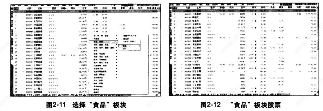 步骤2:在该页面中单击下方的一排板块选项卡,即可在不同股市板块中切换。这里单击“行业”选项卡,在弹出的菜单中选择“食品、饮料”一“食品”板块,如图2-11所示。