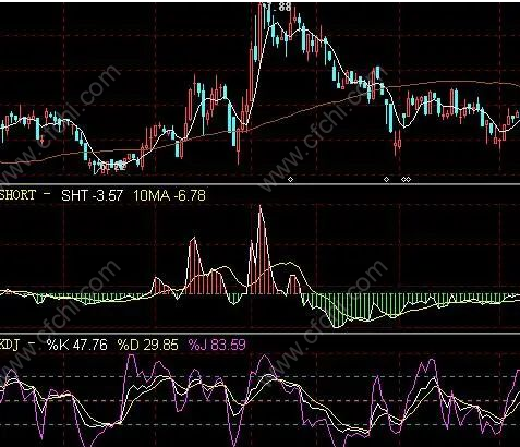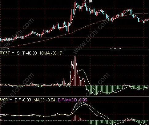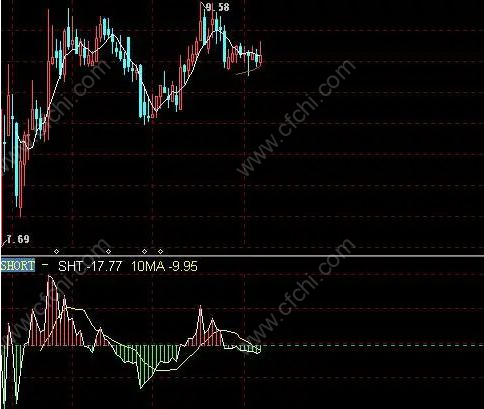 钱龙短线指标(SHT)表现形式类似平滑异同移动平均线(MACD),由白色指标线和黄色均线构成,同时用红、绿色的柱状线表示指标强、弱趋势。指标、均线、柱状线都以0轴为强、弱势的区分参考线。