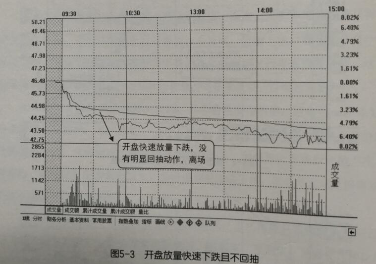 (2)股价一开盘出现快速下跌,且下跌过程中量能逐步放大, 下跌后股价回抽受阻甚至没有出现明显的回抽动作,此时应该坚决离场,不能抱有任何幻想。你 bn