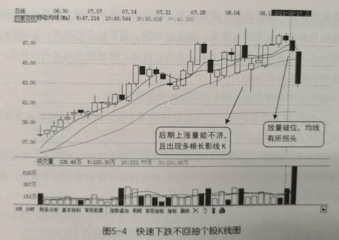 同时我们还可以结合日K线图来辅助判断,如图5-4所示是该股的日K线图,图中显示该股在暴跌前一天,也就是图中显示的2011年8月17日当天股价已经出现明显的放量破位,五日和十日均线同时失守,另外该股在整波行情后期的上涨过程中量能并没有同步放大,在高位还出现了几根带长上影线的K线,综合判断该股在此区域有明显的做头嫌疑,加上当天该股一开盘放量下挫不回抽,完全可判定趋势已经发生改变,必须立刻执行离场决定,结果图中K线显示该股当天收巨量大阴线,股价严重破位。