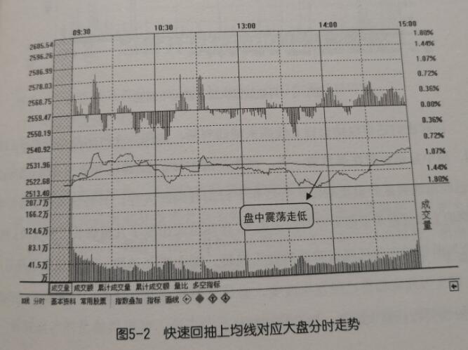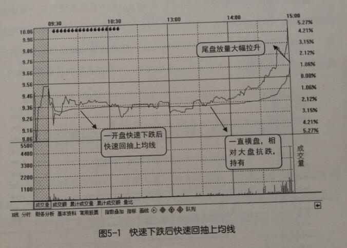 (1)股价一开盘便快速下跌, 随后快速回抽上均线,但股价并没有直接开始走好,而是围绕均价线来回震荡。此时应该对应同步大盘走势进行辅佐判断,如果股价相对抗跌则继续持有,如果表现滞涨则离场为妙。