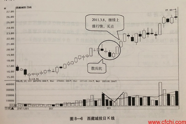 如图8-6所示,2011年3月初,在西藏城投(600773)的日K线图中出现了散兵坑形态,这是主力在强力洗盘的标志。3月8日,股价结束散兵坑形态后继续上涨行情,此时买点出现。