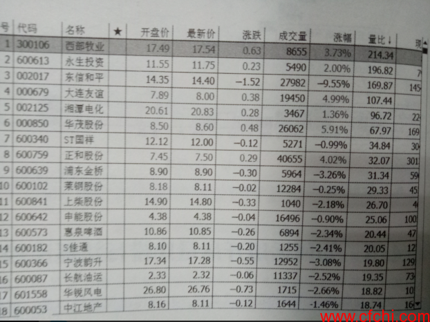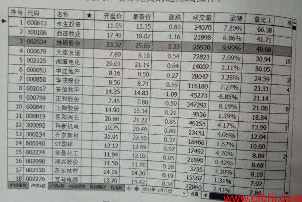 如图1所示是某天大盘9点30分一开盘进行的一次沪深A股量比排行,从图中可以看出当天一开盘处于量比排行前三名的个股分别是:西部牧业(300106)、永生投资(600613)、 东信和平(002017), 其中西部牧业上涨3.73%,永生投资上涨2%,而东信和平下跌9.55%,由此可以看出东信和平是向下异动,直接排除出局,于是就剩下西部牧业和永生投资两只股票进入下一步骤进行跟踪观察。