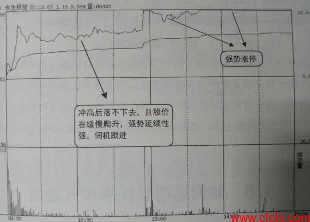如图3所示是永生投资(600613) 当天的分时走势图,图中显示该股当天一开盘仍然出现大幅拉升,但在拉升后并没有出现明显回落,而是高位横盘缓慢爬升,在上午收盘前强势拉涨停,尽管午后涨停打开了一段时间, 但不久后便再次封涨停,直到当天收盘。