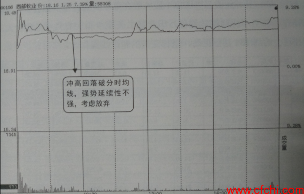 如图2所示是西部牧业(300106) 当天的分时走势图,从图中可以看出该股当天一-开盘便大幅冲高,但冲高后出现明显回落,且在10点后下破分时均线,由此可见该股当天走势强势延续性不够,当天涨停概率在减小,应该可以考虑放弃。