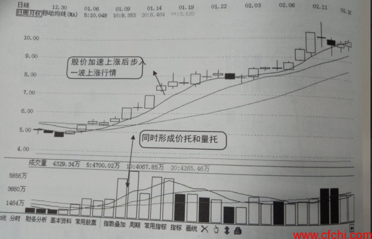 图中显示该股在形成量托后股价加速上涨,量能持续放大,短线收益非常可观,且该股快速拉升之后在次低位强势横盘后继续走强,说明该股中长线仍然有戏,由此可见量托对股价上涨的支撑和促进作用非同一般,希望读者可以认真体会并能在实际操作中灵活运用。