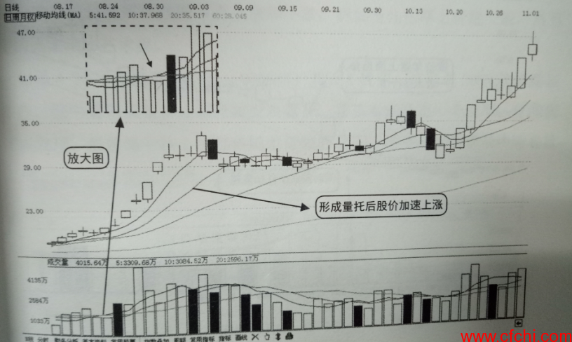 如图下所示是某股的日K线图,仔细观察其量能指标可以发现,在图片的左下角位置,也就是股票的起涨位置出现了一个明显的量托,图片左上方的放大图应该可以看得更清晰,明显形成了一个封闭三角形。