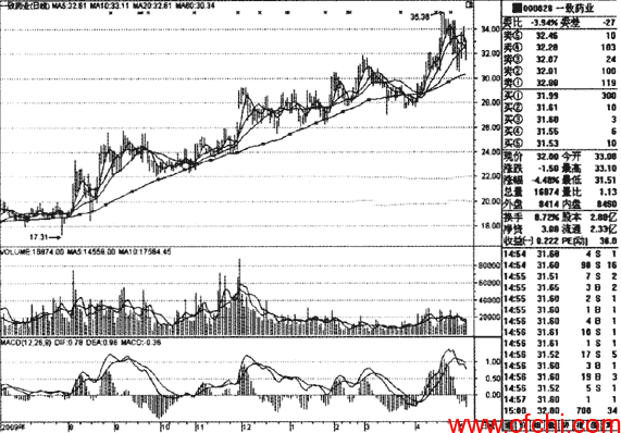 一致药业(000028)从2009年7月29日的最低价17. 31元,到2010年4月23日的最高价35. 36元,半年时间里,股价翻了一番。如图1所示。
