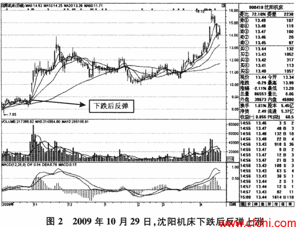 如沈阳机床( 000410)在2009年10月27日和28日连续下跌,股价最低跌至8. 17元,29日该股突然发力,一下封在涨停板上,接着又连续封出两个涨停,从此走出上涨行情。至2010年4月14日,该股创出阶段性新高16.10元,涨幅达97%。如图2所示。