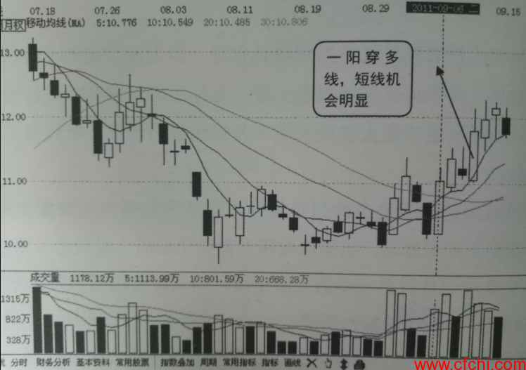 如图2所示,该股在9月6日当天出现放量一阳穿多线的特征,说明短线机会明显,当天尾盘可伺机跟进。结果该股在9月6日之后股价进一步上涨,且上涨幅度不小,如果跟进短线收益理应不菲。