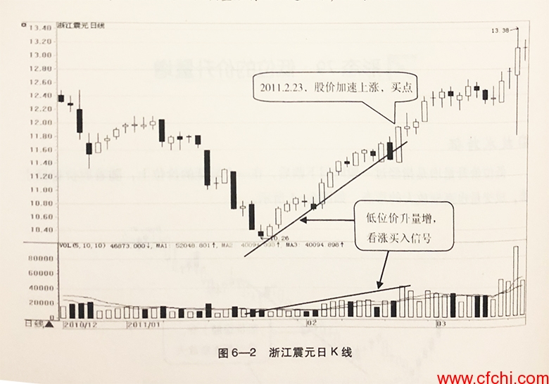 如图6-2所示,2011年1月底开始,浙江震元(000705)的股价经过一段时间下跌后开始见底反弹,在股价反弹的同时,成交量也逐渐放大,二者组成了低位价升量增的形态,这样的形态说明多方力量逐渐积累起来,是股价将持续上涨的信号。