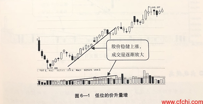 低位价升量增是指经过一段时间下跌后,在一个较低的价位上,随着股价稳健上涨,成交量也逐渐放大的形态,如图6-1所示。