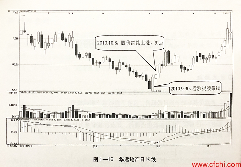 如图1-16所示,在经过较长时间的下跌之后,2010年9月30日,华远地产(600743)在低位出现看涨捉腰带线,发出看涨信号。第二个交易日,即10月8日,该股股价继续上涨,没有创出新低,买点出现。