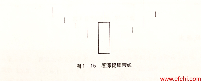 如图1-15所示,这种在低位出现的,开盘价基本是当日最低价的中阳线或大阳线,即为看涨捉腰带线。