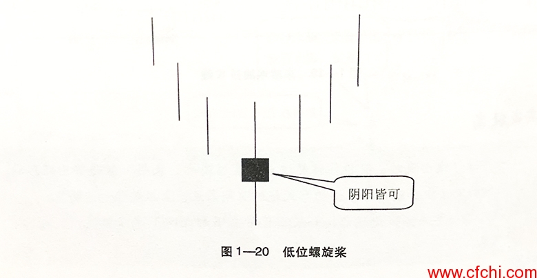 如图1-20所示,这种在下跌走势中出现,外形像螺旋桨的K线,即低位螺旋桨形态。