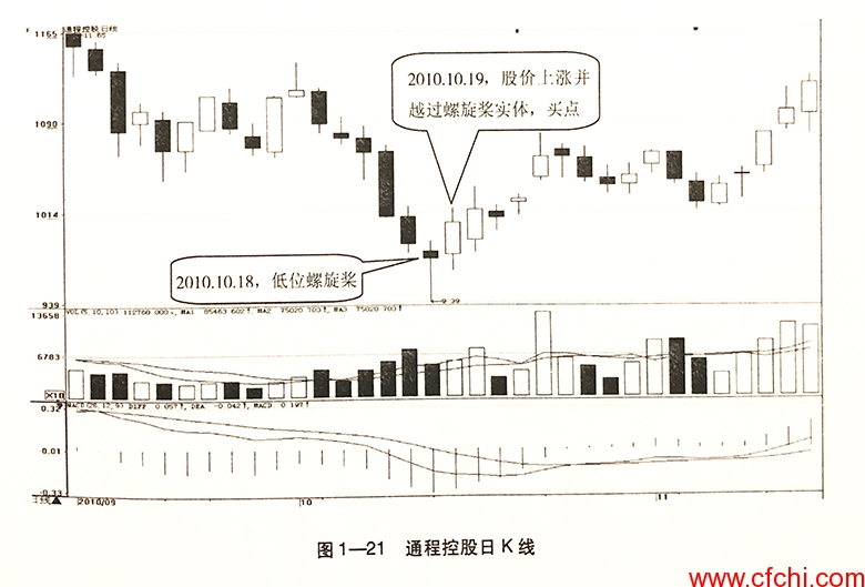 如图1-21所示,在经过前期较大幅度的下跌之后,2010年10月18日,通程控股(000419)出现低位螺旋桨形态,发出看涨信号。第二个交易日,即10月19日,该股股价上涨并越过低位螺旋桨实体,买点出现。