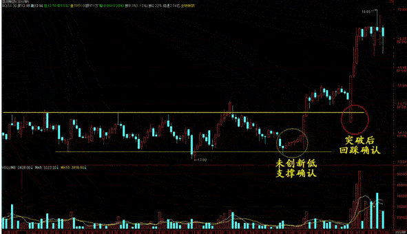 K线平台上和分时图上也一样,当然这是分时的,虽然是分时看的,5个交易日构成的日K线也是一个平台了。事实上,日线上的平台消化压力,在箱体底部获得支撑,突破后回踩确认然后一举突破的