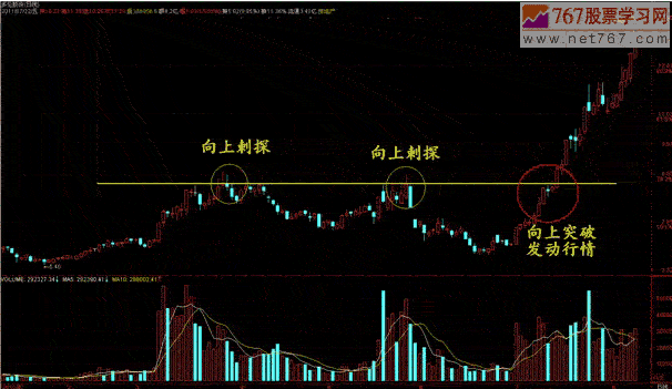 在实盘中,向上突破前主力通常要向上多次试试探,K线形态上形成向上刺探的形态,见下图(三)。