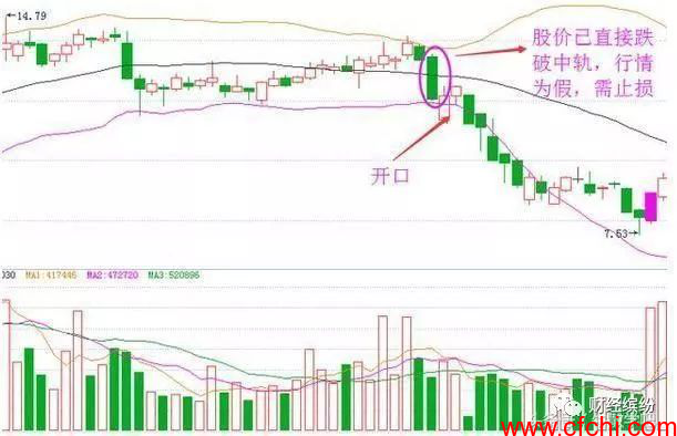 开口代表行情的启动,大家都喜欢这种主升浪行情,但好的行情不是一蹴而就的,这时候需要有效确认才好入场。通过上述我们对于布林线开口的了解,我们的止损技巧就是把止损位置放到中轨上方一点即可,一旦是股价回调的时候跌破中轨,即可看出这波行情为假。