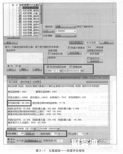 图3-1是评测五星超跌指标中四星超跌状态成功率的。评测时间为1998年1月1日至2016年2月20日(笔者进入股市那一年到现在),评测在不止损的情况下,20个交易日内获利20% ,18年的时间共有24688条指示,出击的数据量足够大可以说明问题,折合每年有1371次机会,其成功率为68.03 %。从成功率的角度来看,这样的数值还是不错的。