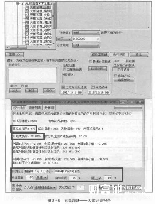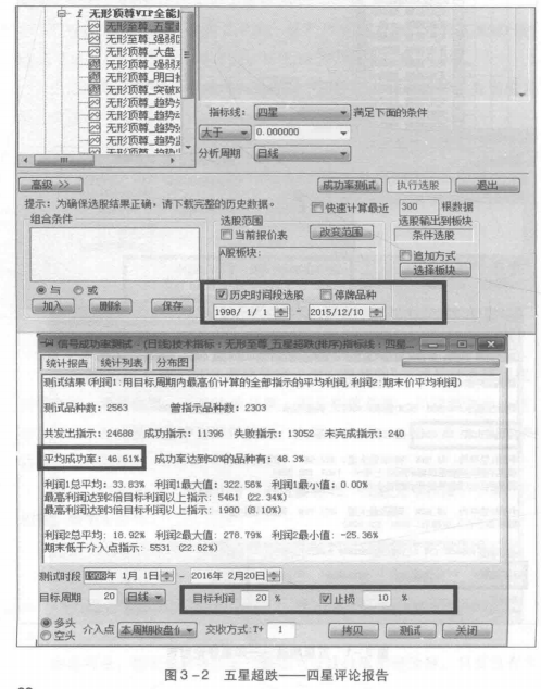 图3-2是评测五星超跌指标中四星超跌状态成功率的。评测时间为1998年1月1日至2016年2月20日,评测在达到10%亏损便止损的情况下,20个交易日内获利20%的成功率,此时的成功率只有46.61%,比68.03%的成功率低了许多。我们再来看更多的报告。