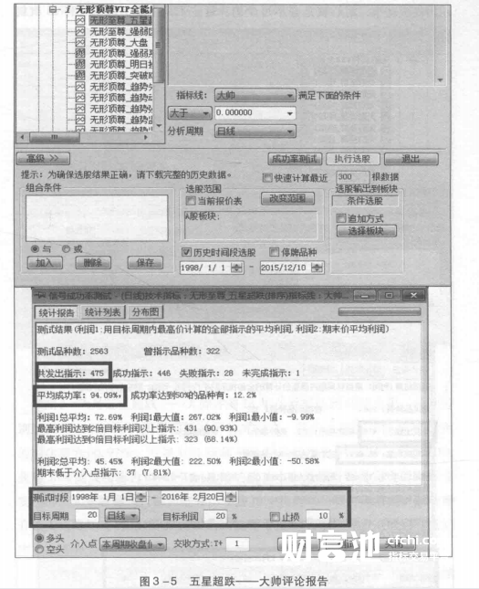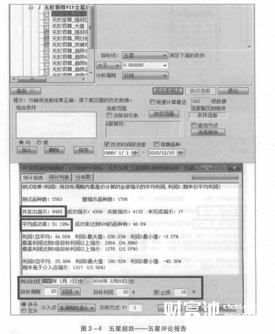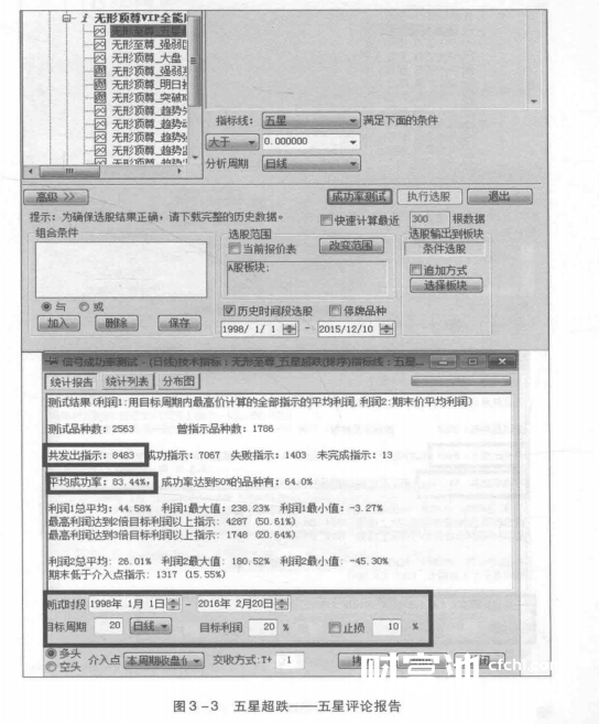 图3-3是评测五星超跌指标中五星超跌状态成功率的。评测时间为1998年1月1日至2016年2月20日,评测在不止损的情况下,20个交易日内获利20% ,18年的时间共有8483条指示,出击的数据量足够大,可以说明问题,折合每年有471次机会,其成功率为83.44%,这样的成功率是非常优秀的。下面接着来看再次加入亏损10%便止损的条件结果又是怎样。