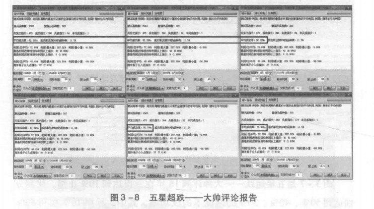 图3-8中把大帅的赢利目标统一为50%。止损50%的情况下成功率为82.28% ,止损40%的情况下成功率为82.28% ,止损30%的情况下成功率为82.28% ,止损20%的情况下成功率为81.86%,止损17.6%的情况下成功率为76.79% ,止损13.4%的情况下成功率为75.95%。
