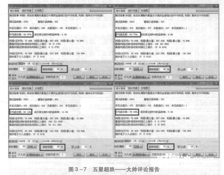 图3-6中五星超跌——大帅加上亏损10%的条件后,成功率为65.82% ,这样的成功率也是可以实现赢利的。那我们就接着试验,看一下在止损10%的情况下,20个交易日获利30% 、40% 、50%的成功率又是多少。