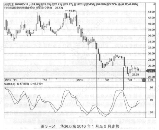 在图3-51中,华润万东的股价在2016年1月时出现了几天的小反弹,虽然股价处于整体下跌的中途,但从当时的角度来看,谁又能知道到底是底还是下跌的腰呢?并且反弹时的K线又与真正反弹出现时的K线形态是那么的接近。