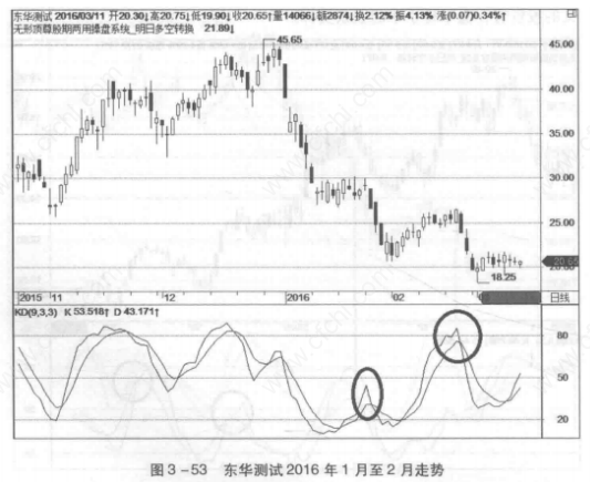 到了2月随着指数上涨的带动,股价再度出现反弹的走势,而后KD指标随股价的下跌再度形成死叉,第二次的死叉位置相比第一次死叉的位置要高许多,但在使用KD指标辅助进行止损操作的时候,指标数值的大小并不需要关注,关注的应该是指标的风险信号是否出现。