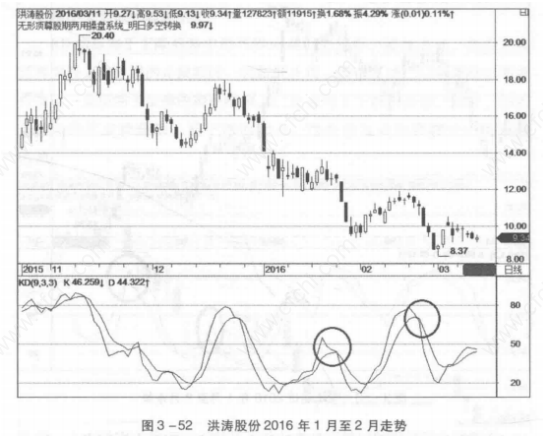 在图3-52中,洪涛股份在2016年1月出现了一次反弹的走势,这一时期的反弹非常弱,股价的波动重心基本上就没怎么上移,不过由于同期指数也出现反弹的走势,因此,很容易给投资者造成一种大 盘与个股同步见底的感觉。下跌途中,这种假底部真的是太多了,一次又一次的吞噬着投资者的资金。